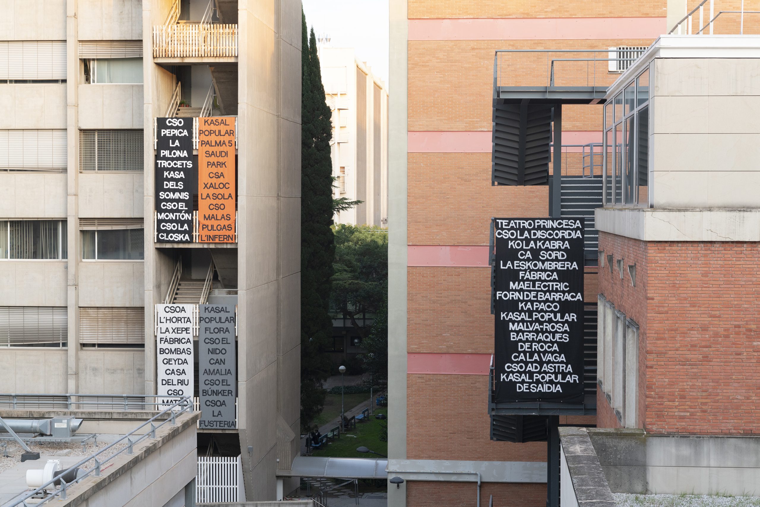 Els crits, propone reivindicar el movimiento okupa como parte de la historia local, entendiéndolo como un agente productor y articulador de relatos que conforman el presente. El proyecto consiste en una instalación de pancartas de gran formato en las que aparece los nombres de diferentes espacios okupados desde los años 90 hasta la actualidad en Valencia. No todos los espacios nombrados responden a las mismas tipologías pero son, en su conjunto, espacios que supusieron brechas para la resistencia y la solidaridad.