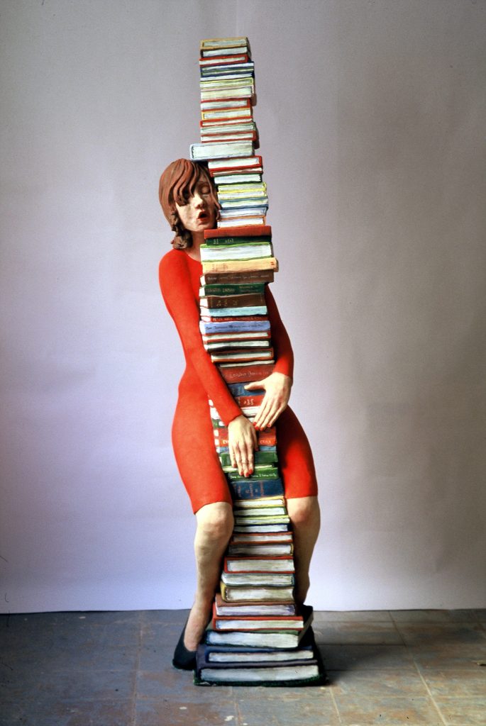 Abrázame fuerte es mi homenaje a los libros y a quienes los escriben. Se trata de una mujer abrazando a una pila de libros más alta que ella. Viste un vestido rojo pasión, y con pasión y con cara de éxtasis, abraza a sus cuentos y novelas favoritas, de sus escritores favoritos, en un intento de retener los buenos momentos que le han dado escapando de la soledad y el aburrimiento, enriqueciéndola con todo tipo de aventuras, paisajes y sentimientos. Al confeccionar la lista de mis libros favoritos me sorprendí al darme cuenta de que yo había leído muchos más libros de hombres que de mujeres. Desde entonces mis compras y recomendaciones de libros es más consciente.