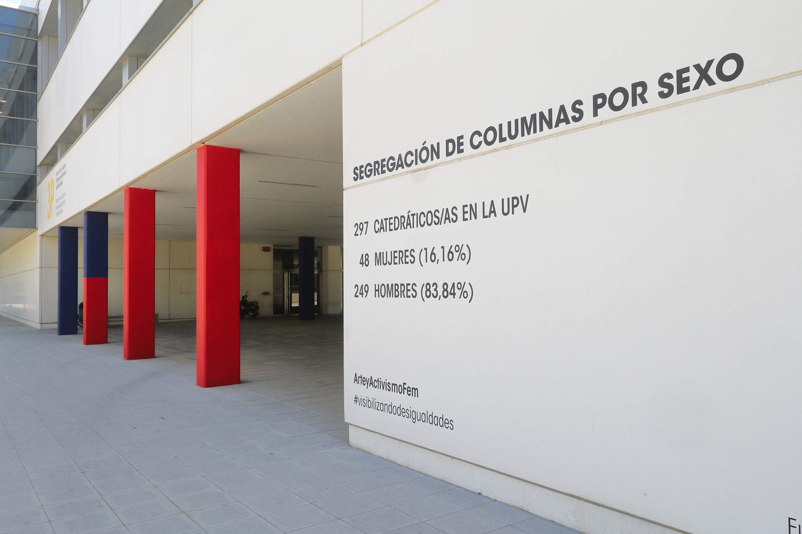 Colectivo ArteYActivismoFem. Segregación de columnas por sexo. #VisibilizandoDesigualdades. (2018). Intervención de arte público/pintura y vinilo transferible sobre pared (Work in Progress, 2018-2023). Medidas de las columnas del Edificio 3P de la Escuela Técnica Superior de Ingeniería Agronómica y del Medio Natural de la Universitat Politècnica de València UPV.