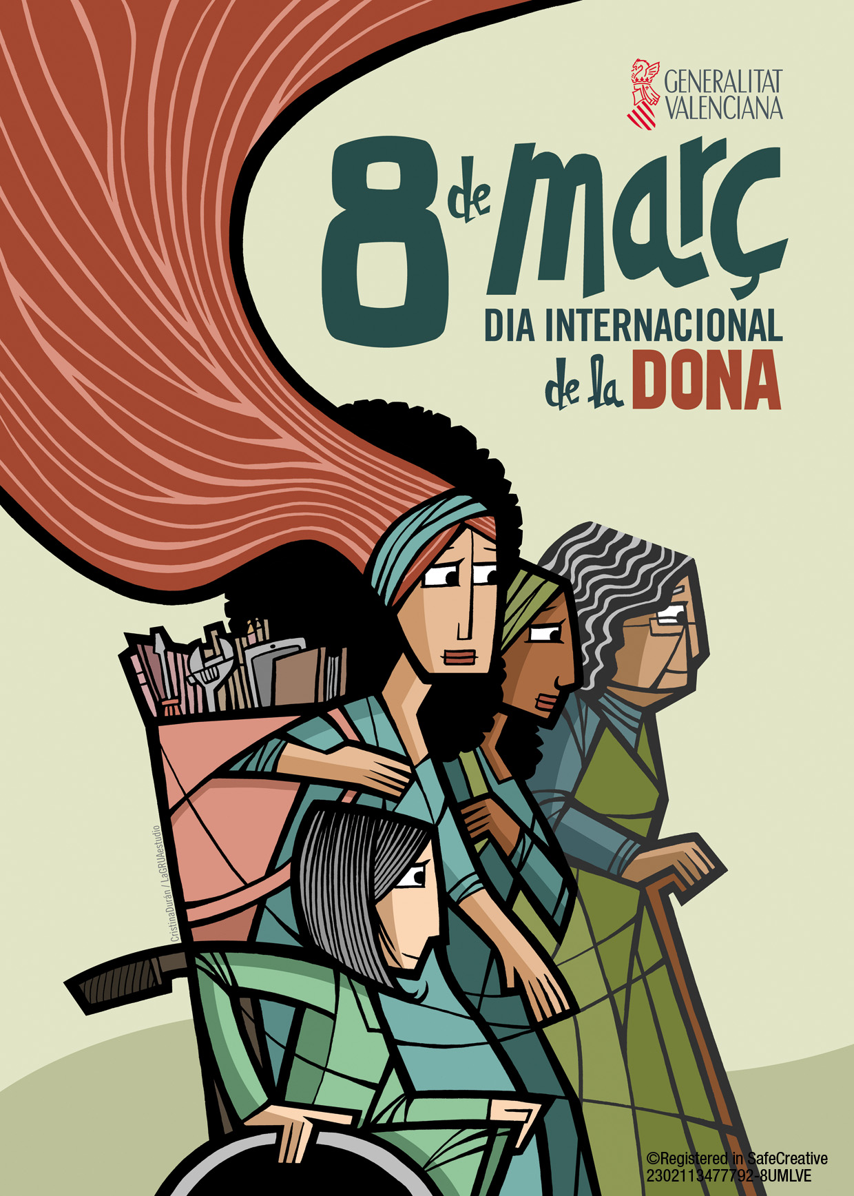 Cartel realizado para el día de las mujeres y publicado por la Generalitat Valenciana. Refleja la diversidad. Diversas edades, colores y capacidades. Todas las mujeres están incluidas. Mujeres activas, trabajadoras, creativas y que avanzan juntas. Sororidad.