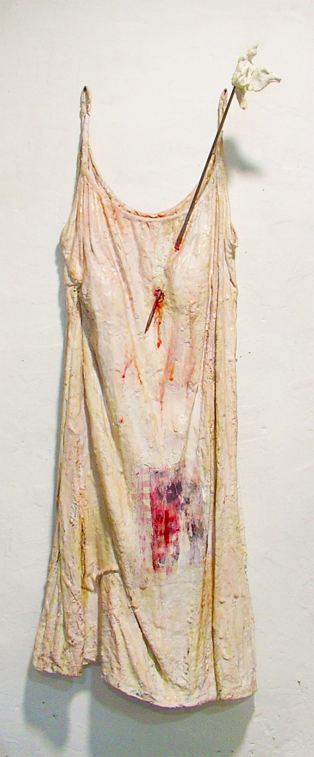 Escultura relieve. Vestido de mujer con un mensaje de dolor sobre violencia de género. El alfiler, en forma de ave, es parte decorativa del vestido, a la vez que es un símbolo metafórico de alivio, por ello este ave extrae el dolor y lo eleva como halo de esperanza.